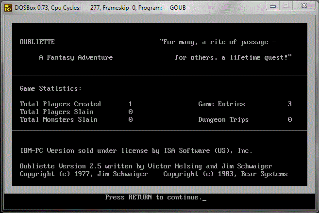 DeleteThank you for this blog. An update for you: the 1977 version was written for the CP/M operating system. I have a copy. The most unique feature is that the Pseudo Dragon data has a glitch: occasionally you can give it one too many hits and throw its hit counter into the negative - necessitating taking 64k hits for it to die. Twenty minutes standing on the "k" key with a level 54 Human Samurai wielding the Axe of Mortokgor, usually does the trick. This version runs under all versions of Digital Research's OS, as well as ZR-DOS and ZPR3.