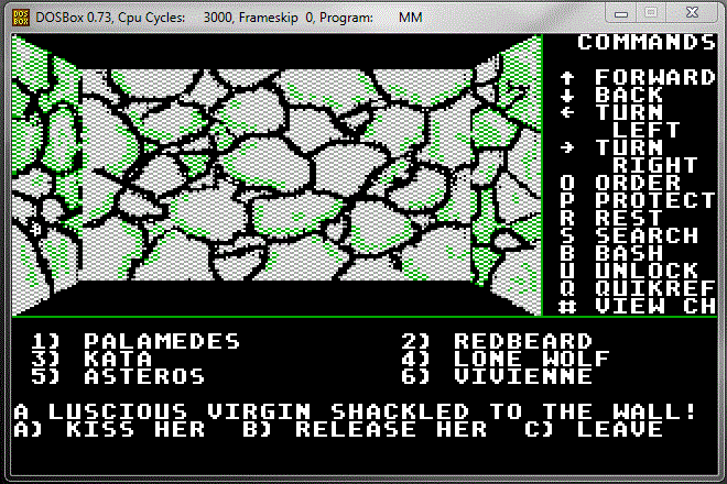 3. NPC Interaction. The game is devoid of visible NPCs, but you come across them in certain squares, and your encounters with them are essential to advancing the game and learning about the game world. The game is one of the first to introduce choices in your NPC interactions--not dialog choices, unfortunately, but very basic ones such as whether to kiss, release, or ignore a maiden you find chained to a wall. A little better than The Bard's Tale (or, at least, more than The Bard's Tale) but not nearly as complex or satisfying as Ultima IV. Final score: 4
