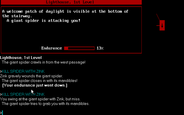 Beyond Zork changes all of that by introducing first, a lot more monsters, and second, a skill-based combat system in which your strength helps determine the damage, your dexterity helps determine your chance to hit, and your endurance determines how many blows you can take. There's still quite a bit of luck involved, though.