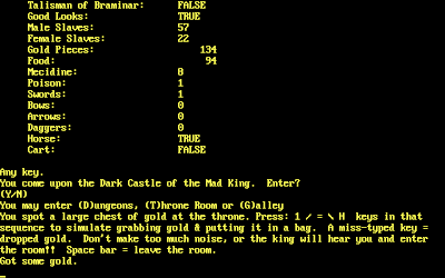 - You come upon the Dark Castle of the Mad King. Enter? (Y/N)