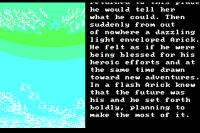 There is no character creation: everyone starts playing Arick with the same statistics and equipment. Leveling is swift and satisfying in the first half of the game and then suddenly (and maddeningly) freezes to a halt at about the halfway mark. This is one of the few games of the era to give you experience point rewards for quests (3). NPC Interaction is important--you learn valuable things from them, and some of them are interesting--but it is all one-way (5).