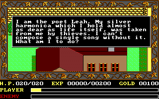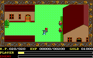 Neither the manual nor the game tells you who you are, but I gather from the MobyGames summary that the character is Adol Christian, and the starting town is called Minea. You don't get the main quest right away. Instead, you get a few side quests from exploring Minea and a village nearby. Already I've been tasked with:
