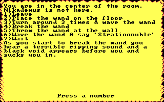 Messages sprinkled throughout the Castle had spelled a message: "Welcome, adventurers, to my castle. If you join me in my evil ways and destroy Lord Wood, you will be greatly rewarded. To find me, break the wand in the magic circle in my room." Thus, I broke the wand I had found in the first dungeon and was granted passage to another plane, where I at last found Nikademus's Castle.