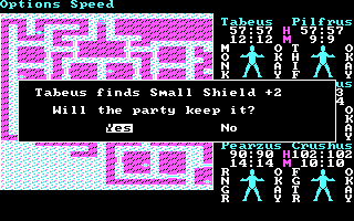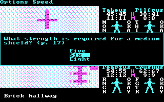 • The game features a very annoying form of copy protection. It appears that every time you move your party to a special encounter, there's a random chance that a question will appear, and it seems to happen about 33% of the time. The questions ask arcana from the game manual. It wouldn't be so bad if it was 5% or 10% of the time, but as it is, I have to keep poring through this PDF file.