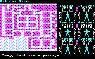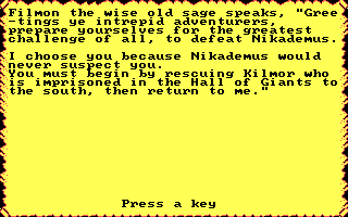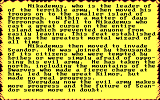 Among the items found in the archives are scrolls that (again, like in Phantasie) slowly help explain the game world and its history, geography, people, and features. They also summarize the previous games but without acknowledging the fact that Nikademus died in them.