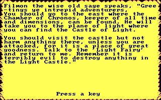 Chronis turned out to be an absent-minded, narcoleptic sage who fell asleep while I was talking to him. In his chambers, though, I found the codes necessary to activate his device and transport myself to the Plane of Light, and the key I needed to admit myself to the castle.