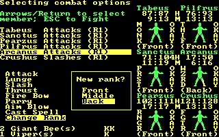 - I realized belatedly that there's a "change rank" option in combat that lets you assign party members to the front, middle, or rear. Those in the rear can still be hit by melee weapons of enemies, but apparently they have a lower risk. I have the resurrection spell now, but using it costs a point of constitution, so I'd rather stop having to raise my wizard. I put him in the rear rank.