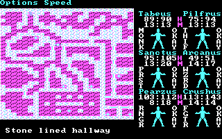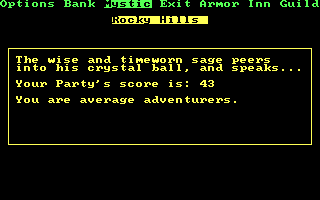 There I solved a couple of puzzles to obtain some nice bows. Bows, I find, do less damage than melee weapons, but in the hands of a character with a lot of skill, they greatly increase the chances of an immediate fatal wound. The random monsters in the Gnome Caverns were quite tough, and my characters all advanced to Levels 11-12. Oh, and in one of the rooms, a wizard took all my gold and experience for a powerful spell of summoning that he swore would help me later.