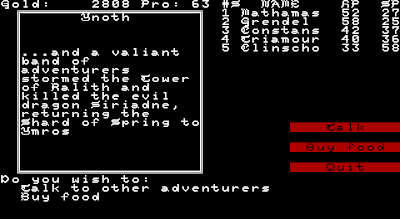 If my entire party dies, on the other hand, not much choice there. I need to reload. You can see where this is going. If a battle goes poorly and I lose a couple of characters, suddenly my other characters lack a certain motivation for victory. You could even say that their depression makes them distressingly suicidal. This hasn't cropped up in a lot of other games because most of them are either single-character or limited-save. In Might & Magic, when I could only save in towns, it was always worth it to haul dead characters back to a temple, lest I lose all that adventuring time. But in games where you can save every step, like Demon's Winter, the dynamic changes.