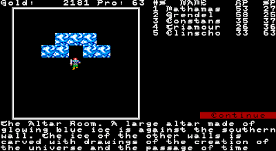 A nearby cave contained a "prayer scroll," and towards the bottom of the dungeon, I found an ice door with a hole in it, which turned out to accept the icicle I had found yesterday. This teleported me to an altar room, where using the prayer scroll summoned an ancient god who gave me the main quest.