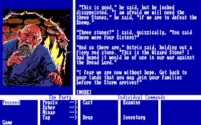 This isn't even remotely a CRPG, so I have no idea why I played it as long as I did. The writing was good and the story decent and the puzzles were interesting, but a good game gives you more options for solving them and is less obnoxious about ensuring that an extra spell cast in the first five minutes keeps you from winning in the last five. Maybe this is par for the course in "adventure games," but I'm not an Adventure Game Addict. Might & Magic II is coming up, so let's plow on forward.