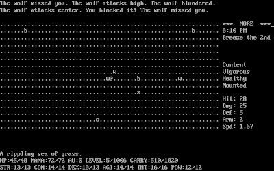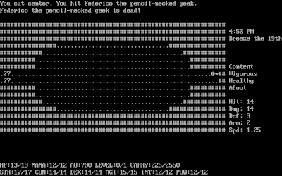 ReplyDeleteI played this one back in the day but gave up before getting far. I remember some cute (but not useful) things: There's a funny message if you try to talk to an animal. Also, I think it's possible to get "struck by a cosmic ray" and die if you walk around at 1hp.