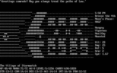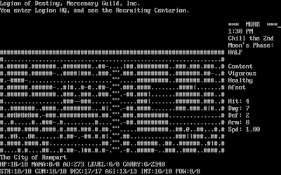 This quasi-roguelike was written by Laurence Brothers, apparently while he was at the Rutgers University Department of Computer Science (that's where he wants me to send his check). It's "roguelike" in its basic appearance, with ASCII symbols representing the game world and its denizens, its use of upper- and lower-case keyboard commands, and its permanent death. It isn't a roguelike in its complexity. This is a game with multiple dungeons and villages, quests, guilds, shops, locked and unlocked doors, alignments, dialog with NPCs, houses you can burglarize, and a ton of other features I've barely scratched.