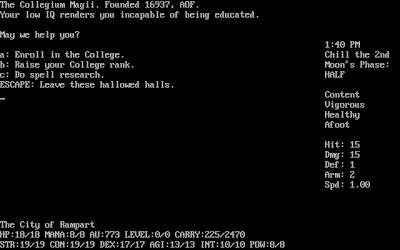 I don't want to reveal too much about myself, but suffice to say I got an intelligence of 15, a constitution of 14, strength and dexterity of 11, agility of 10 (I shouldn't have said I was "accident-prone"), and virtually no magic power--this is the first CRPG to punish me for being an atheist. Statistics matter, as I soon found out with another character: