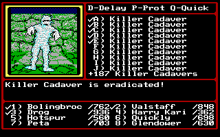 4. Encounters and foes. Andrew Schultz's walkthrough of the game lists an unsurprising total of 255 different monsters. They were extremely varied in their attacks and even more so in their resistances. Some are resistant to certain sexes, some to various types of magic, some to melee weapons. A good player needs to take careful notes or have a good memory. I wasn't a good player. I kept forgetting if it was the Cursed Corpse or the Coffin Creep that drains your magic, and whether it was the Iron Wizard or the Warbot that casts "Eradicate." It doesn't help that many use the same icons. The game allows you to encounter up to 255 enemies at once, which is a lot more than the first game and provided a unique challenge in the beginning stages. In later stages, mass encounters were generally fodder for the CTRL-A combo, although going back to the Tundara dungeon and casting "Holy Word" on 200 Killer Cadavers was definitely a high point. There's a good balance between random encounters and fixed encounters, and rarely did it seem (unlike The Bard's Tale III) like there were too many encounters. Final score: 6.