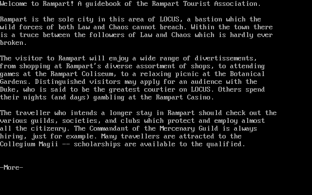 The extra money allowed me to get entrance to the library, where I read a history of the City of Rampart and got a little more information of the game world, which might be called LOCUS. The world seems to be torn between the forces of law and chaos, each with its pantheon of deities. The Gods of Law include Odin and Athena, and the Gods of Chaos are Set and Hecate. Nice blending of mythologies there. There are also Druids, who seek to maintain a balance and some mysterious beings called Lords of Destiny, who arbitrate between the two forces.