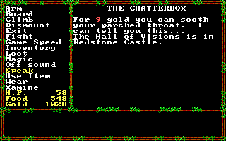 I've never seen this game before (though I have heard of it), but man is the colour palette ever ugly. Well actually the text boxes and inventory, etc. seem alright but the overland map and gambling screens are burn your eyes out brutal. I guess as I got older, I lost my tolerance for staring at neon green for any length of time. Anyway, stuff like this tends to make me wish for an alternate reality where old game designers found inspiration in Ultima's use of black in their tile sets. Hopefully the rest of the game has some interesting features, though.