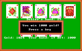 The dealer busted spectacularly. I now have 2,024 gold. I'm going to see my mother for dinner tomorrow night. I can't wait to tell her.