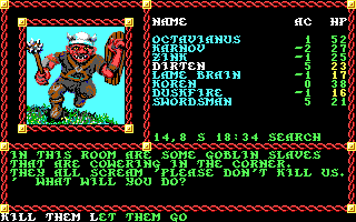 I kept finding slaughtered hobgoblins with blood graffiti on the walls indicating that "Skullcrusher was here." Skullcrusher happened to be in the literal last square I searched on the map, imprisoned in chains. Apparently, he was a servant of Councilmember Cadorna, sent to the complex to retrieve the same heirloom box that was the object of my quest. I guess I could have taken him as an NPC if I'd had a slot free, but I didn't, so he happily went back to his master.