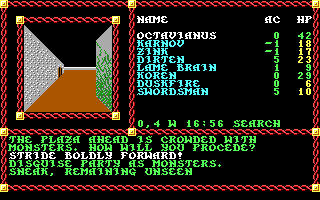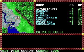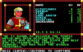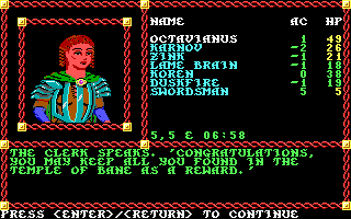Having completed these areas, Octavianus is a Level 5 fighter, Karnov is a Level 4 fighter and a Level 5 thief, Zink and Duskfire are at Level 4 in both fighter and mage classes, Lame Brain is Level 4 in both fighter and cleric, and Koren is a Level 5 cleric. My swordsman NPC is also a Level 5 fighter. He's risen twice, and I've had to front him the gold both times.
