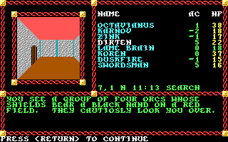 My Level 4 characters, undoubtedly egged on by the NPC Dirten, decided they had no fear of inciting the wrath of a god. I destroyed the temple and was attacked by a horde of orc fighters and bowmen led by an orc cleric named "Mace."