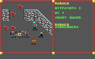 As in all D&D games of the era, whether you connect with an enemy depends on your THAC0 ("to hit armor class 0") score, which in turn depends on dexterity, strength, the weapon wielded, and the way the enemy is facing. This is a bit of a neat implementation of the rules. The first character to attack an enemy attacks head-on (if the enemy was facing away when the attack starts, he turns to face the attacker). All subsequent characters strike at the enemy's side or rear, with consequent THAC0 bonuses. If a thief attacks from the rear, he has a chance of backstabbing the opponent, but I've yet to get this to work in this game.