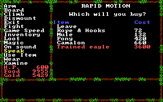 One of the transport options was a "trained eagle," on whose back I soared! Not only did this take the place of the boat, but it prevented me from having any random encounters in the wilderness. That fact alone did a lot to get the game back into my good graces.