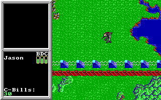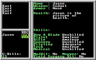 The game starts off in the Pacifica Training School, a walled compound,where Jason is still learning to be a MechWarrior. Actually, I should say "just started learning," because I begin "unskilled" at everything and have only 50 gold pieces. Or "c-bills." Whatever. The game is iconographic, with Jason represented by a tiny little icon who moves around between buildings, some of which don't seem to be enter-able. So far, I've discovered: