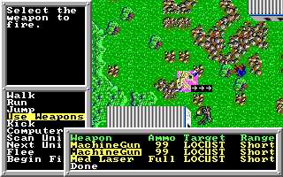 The third mission had me using weapons for the first time to shoot at an empty shell. I had the option to let the computer fight for me, but I didn't take it. Combat takes place on the same screen as regular navigation, but with different options for movement and engagement, not unlike Pool of Radiance or other SSI games. You can move by walking or running, jump (if you have jump jets), kick an enemy unit, scan a unit, fire weapons, and flee. You line up your actions and then "Begin Fight" to execute them.