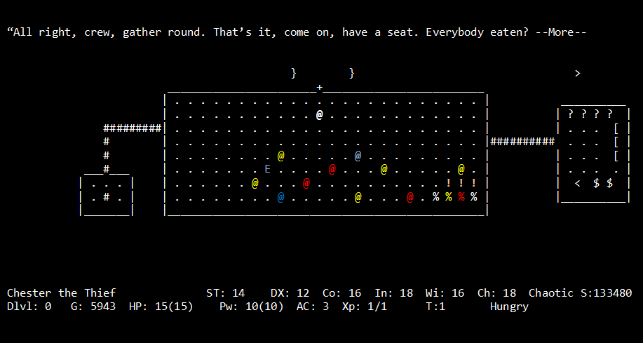now on another note....god i hate nethack, it hooks you in for just a few minutes diversion while youre waiting for the wife to get out of the shower and then 12 hours later youre still playing, stinking of your own sweat because you skipped your shower to play nethack "just one more level". and for a beginner like me, all those little characters are like greek. you have no idea what any of them mean. there are so many commands to memorize that you get lost on what to do/when to do it. not to mention every key has two totally different functions. did i mean to press "w" or "W". but god youve got to love it too. its like that chick that you know is gonna give you something, but you go out with her anyway. nice work.