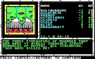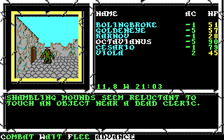 DeleteI remember the battle with the Bits O' Moander. I had to repeat it a few times before I finally won. I recall finding that whole Moander area quite challenging. I recall my cleric's weapon being almost useless against the shambling mounds, as I believe only bladed weapons were able to do significant damage to them.