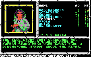 Our purpose for being in Yulash was to find the cultists of Moander, one of the three remaining holders of our bonds. According to the Forgotten Realms wiki, the elves battled and sealed Moander (the god of rot and corruption) from the material plane some centuries ago, but since then, his cultists have been trying fervently to bring him back. The unwitting participation of Alias and her party in one of these resurrections makes up a major part of the plot of Azure Bonds, the novel on which the game was partly based. Alias and her friends were able to destroy the god's avatar, and the cultists were back to square one. Apparently, that's where my party comes in.