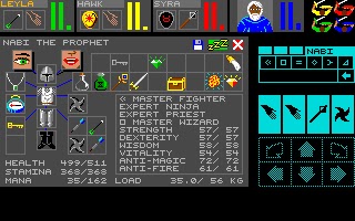 Dungeon Master's system of "reincarnating" or "resurrecting" existing heroes rather than just creating your own characters, and the process suffers a little more in this game than the first, because you have such a weird variety of bestial characters to choose from (contradicting the previous game). The skill-use-based development system, on the other hand, remains very good. Although leveling doesn't come as rapidly as in the first game (my characters gained maybe 2 or 3 wizard levels, 1 fighter level, 1 priest level, and no ninja levels) if you import characters, it's extremely satisfying when it does, and there are nice rewards in terms of statistics. I like that you can choose to make characters specialists or generalists this way. This game introduced a new element by aspecting the paths to these various skills, making it rather important to have an experienced wizard on the DAIN path and competent fighters on the KU path. There are still no real role-playing choices, but I was otherwise very satisfied with this area of the game.