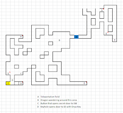 I'm thinking this dragon level might be the lowest level because there were no pits nor down staircases. I also think it might join up with an area I mapped in a previous game (a common teleport field goes to the same place). I tentatively merged the two areas on my map (below), but I also could be way off.