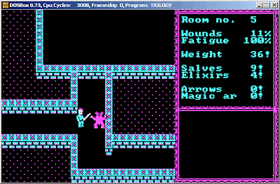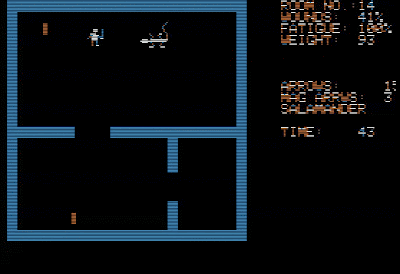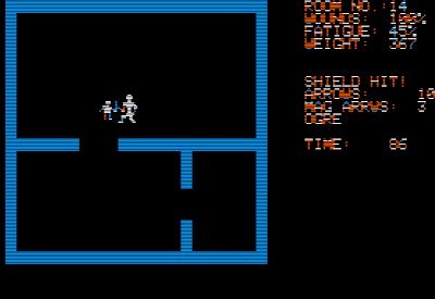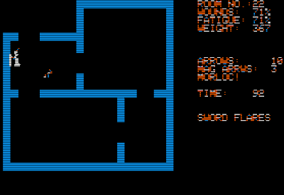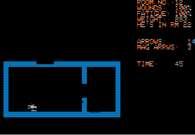 The "levels" of the "dunjons" fit entirely on a screen, so unlike as in Apshai, it's extremely easy to tell where there's a secret door. Despite this, the game makes you hit "(E)xamine" multiple times to find it. There's no visual indication of the stairs; you have to read the manual to know that they're always in the bottom-left corner. There's no way to pause the game at all, and since enemies can generate randomly right next to you and attack in real-time, you can't even take a bathroom break (let alone a blogging break) while playing.
