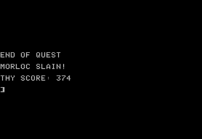 3. Search the room until Morloc appears and then beat at him until he's dead. At this point, the game gives you a brief "win" screen, your score, and dumps you to a prompt. The score is based on the number of creatures you killed, how quickly you defeated Morloc, and the difficulty level you chose at the beginning.