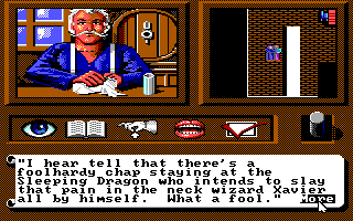 - Visited the tavern. Ate some stew that was so bad that it caused me to faint, but got a book of matches. Found 40 gold pieces in a barrel. Talked to a dwarf fighter named Sir Isaac who wanted some apples. Tipped the bartender for some intelligence and found that a man staying at the inn plans to take on the evil wizard Xavier by himself.