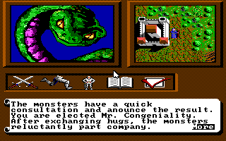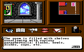 In tone and approach, the game invites comparison to Hero's Quest: It isn't very serious about itself, it takes place in a fairly limited game world, it has a bunch of light puzzles, and it's not terribly hard. It lacks the wit and...oh, I don't know..."jauntiness" of Hero's Quest, but it has a few of its own innovations, not the least of which is the ability to control a large party of characters instead of a single NPC. In fact, it's one of the first games on my long list in which a player-created PC is joined by memorable NPCs who maintain their personalities even after they join the party. This is something we'll see in Ultima VI and Ultima VII, which makes sense as this is also an Origin game.