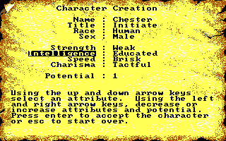The character has a standard set of attributes--strength, intelligence, speed, and charisma--with the current level given not as a number but a textual rank. Strength proceeds through "puny," "weak," "athletic," "mighty," and "powerful"; charisma's levels are "offensive," "tactful," "diplomatic," "influential," and "persuasive." They start somewhere in the middle, and during character creation, you can trade levels in one attribute for those in another. The uses of the attributes seem straightforward: strength and speed help in combat, intelligence affects spell points, and charisma determines the selling price of items in town.