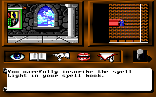 The spellbook is a key to both puzzle-solving and overall survival. As I mentioned, you start with it blank and slowly accumulate spells during your explorations. The first one I found was "Light," right in Eldritch's tower.