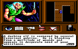 Icons across the middle of the screen provide the actions of the game: look, cast a spell, take an item, talk to an NPC, perform an action, drop or give an item, save the game, view the party's statistics, equip weapons and armor, and rest (there's a second row of icons toggled by the switch to the right). Each of the actions has a handy keyboard shortcut that makes gameplay much faster.