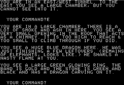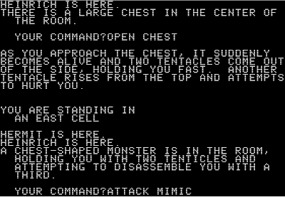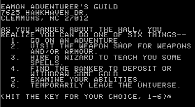 Eamon is a cross between an RPG and a text adventure. Aside from the opening-screen graphic, the entire interface, including all commands, is text. Each module, or "adventure," is a self-contained story that takes maybe 10-30 minutes to play. Each features a variety of monsters, items, and special encounters, but the items aren't portable from one adventure to the next, so what you don't use in the adventure itself, you sell upon return to the adventurer's hall (the nexus among all the adventures). Although there are some common commands (e.g., NORTH, SOUTH, GET, LOOK, ATTACK, OPEN), the specific inputs can change from adventure to adventure.