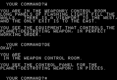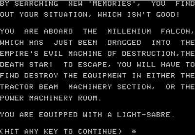 Ah, thank you for bringing back my childhood. I remember killing Darth Vader on the Death Star and finding 'my father's light-sabre'. I remember the huge numbers of identically named guards on the Death Star, and the room with 100 guards. I remember drowning in the Zyphur Riverventure until I realized I had to use the boat. I remember the injury level descriptions 'takes damage but is still in good shape...is hurting...is in pain...is very badly injured...is at death's door, knocking loudly'...is dead! I remember letting the guy out of the Tomb of Molinar and blowing up the universe...