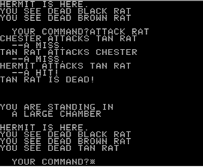 In another side chamber, three rats with sharp teeth scurry over a pile of diamonds. This affords me my first combat. As I attack, two of the rats flee out into the main chamber. I miss. The rat hits me, but the blow bounces off my leather armor. I keep missing my attacks, but fortunately the hermit compensates for my weakness and kills all of them. I grab the pile of diamonds.