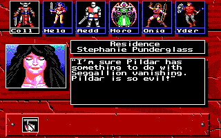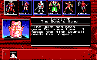 I was pleased to see that the game, like 2400 A.D., adopts the traditional Ultima approach to dialogue, where you type keywords. Sometimes, those keywords will become apparent from the NPC's introductory statements; sometimes, you'll get fed those words by other NPCs. They don't respond to NAME, HEALTH, and JOB, but almost everyone has something to say about "duke," "Seggallion," or "Pildar." As in the Ultima games, four letters (SEGG, PILD) seems like enough to prompt the response. None of The Magic Candle's nonsense where asking about THE LAST UNICORN gives you a different response than LAST UNICORN.
