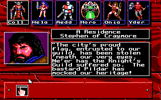 The dialogue ties neatly to itself and the lore presented in the manual. For instance, the manual describes how, during the War of Darkness, Seggallion made one blunder when he was convinced to lead his army's strength into a valley, leaving on a small, elite unit called the Old Guard to hold Shellar Ridge. Once the enemy saw Seggallion leave, they swarmed the ridge, slew most of the forces, but left the members of the Old Guard alive, chopping off their hands. Exploring the town, I ran into two NPCs who referred to "Seggallion's folly" and also a man named Stephen of Craymore, clearly a member of the Old Guard, who had no hands. He was happy to talk a little about Shellar Ridge.