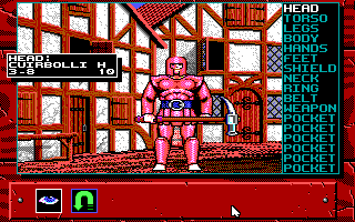 | Reviewing my highwayman's equipment. There aren't many "paper doll" games around just yet; before this one, I can only recall Drakkhen and Galdregon's Domain. |