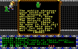 I defeated some jail guardians and talked to the prisoners, several of whom--despite looking like monsters--were clearly good guys. One of them told me to listen carefully to what a Jedist says, "for the answers to your questions are likely to be spoken, hidden deep within the pattern of his response." The next mentioned that "The Answer Lies In Someone's Mental Astral Needs," which clearly spells TALISMAN, although it didn't seem to have any applicability to this area.