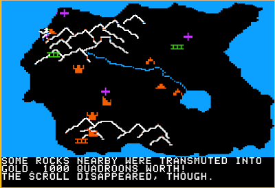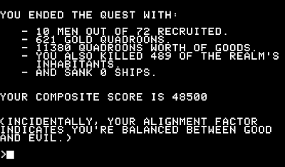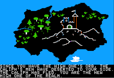 DeleteI just finished this game, and wanted to comment on the part of the game you mentioned missing (finding the orb in the dungeon). You saw the wizard on one of the islands, and he would not let you past him. You need to Offer (key O) him something. He would not accept run of the mill items, but will apparently take magical items. I Offered him a flying carpet. He accepted, and I started the Dungeon Adventure style scenario. Boy, were the controls ever clunky.