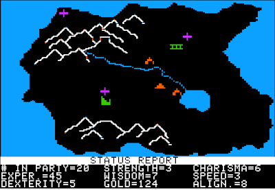 As I say, I can respect the innovations. The programming that went into dynamically adjusting monster levels based on PC levels, the random encounters, the inventory-based puzzles, and even the sea navigation are like nothing else in CRPGs in 1980. But innovative doesn't mean good, and I found the gameplay frustrating and ultimately not fun--really a step backwards from Wilderness Campaign. In a GIMLET, I'll give it: